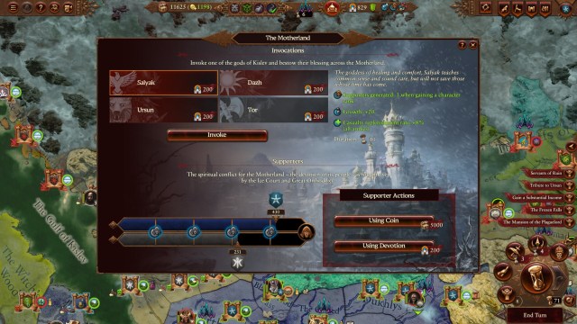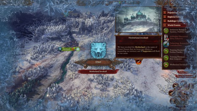 The Motherland is an integral feature that represents the pantheon and political climate of Kislev in Total War: Warhammer III. There are four kinds of Motherland Invocations with factionwide effects lasting 10 turns. However, you can select a different one if you have enough Devotion to spare, and that will replace what’s active. You can also see how many turns are left for the Invocation by mousing over a small icon next to the Devotion amount at the top of your screen.
