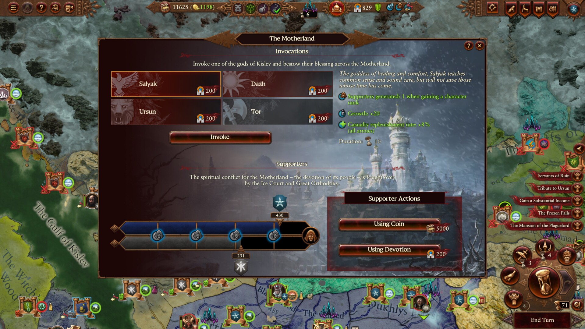 One of your key goals as Tzarina Katarin is to make sure that Kostaltyn is no longer a threat. By spending Devotion on Invocations and subsequently gaining more supporters through your actions, you should increase your Motherland progress bar. For the four earlier segments, you’ll mostly gain control, leadership, speed, and diplomatic bonuses with all Kislevite factions. But, once you hit 600 supporters, you’ll get a chance to confederate with Kostaltyn. This will merge The Great Orthodoxy’s faction with Katarin’s Ice Court (or vice versa if he’s way ahead of you).