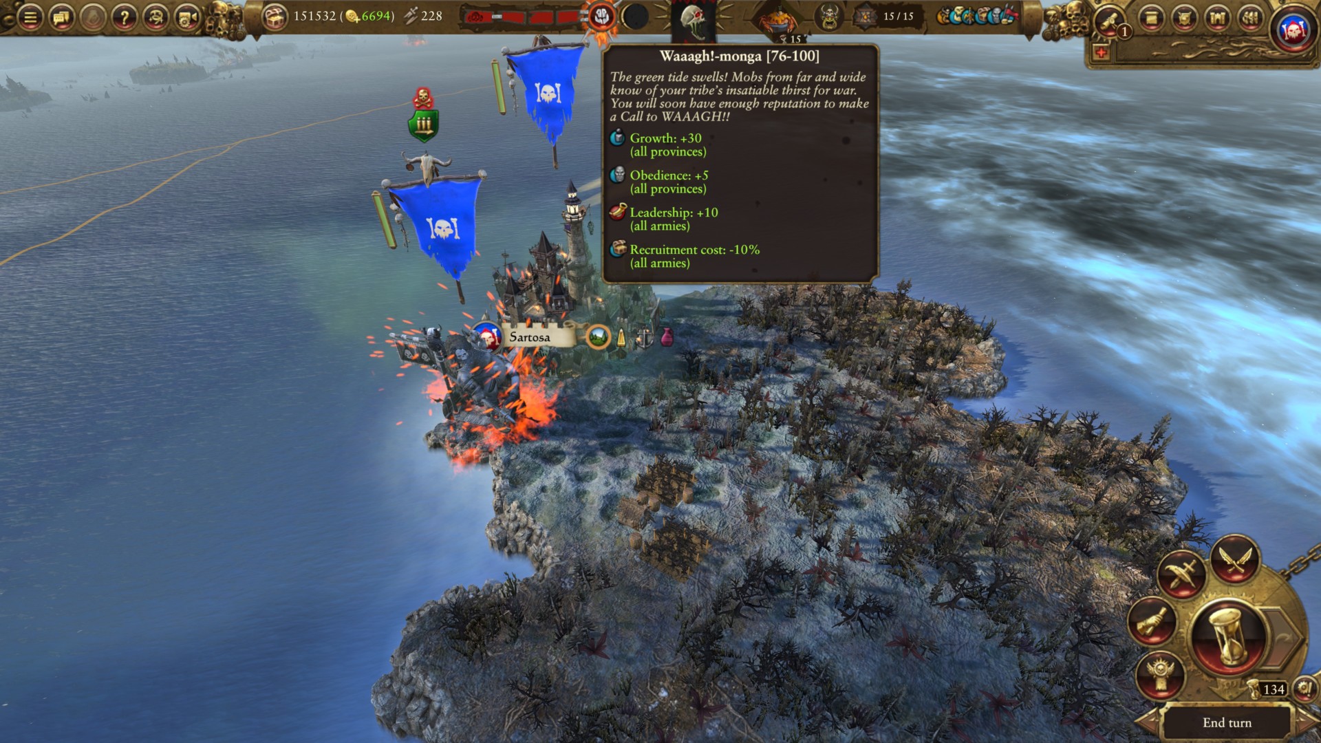 Once you’ve started your Waaagh! you’ll notice that additional troops have been attached to your existing armies. As such, it’s important to have several forces that are ready before clicking that button. As turns pass, you’ll see that more Orcs, Goblins, and Trolls are joining you. That’s because this mechanic actually simulates the Warhammer Fantasy Battles depiction of Greenskins following a strong warboss in his offensive.