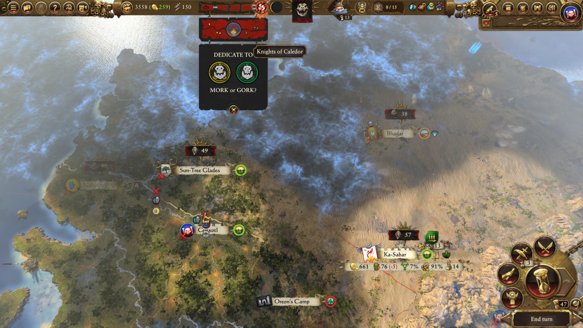 Once you’re ready to bash ‘eadz, err, heads, select a faction’s capital to target. Then, decide to offer this to either Gork or Mork. The former will grant buffs for your melee units and the latter boosts your ranged units. Your lords will also gain the Big Waaagh! ability in battle (which we’ll explain in a while).