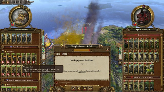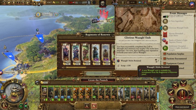 In addition to the trophy buffs that you get when you successfully capture a Waaagh! target, you’ll also be able to recruit new Regiments of Renown (seen below). The ROR units you get are dependent on the faction strength of your target, so beating down any of the top 10 factions will net you stronger troops such as the Feral Hydra or Lava Anachronox Spider.
