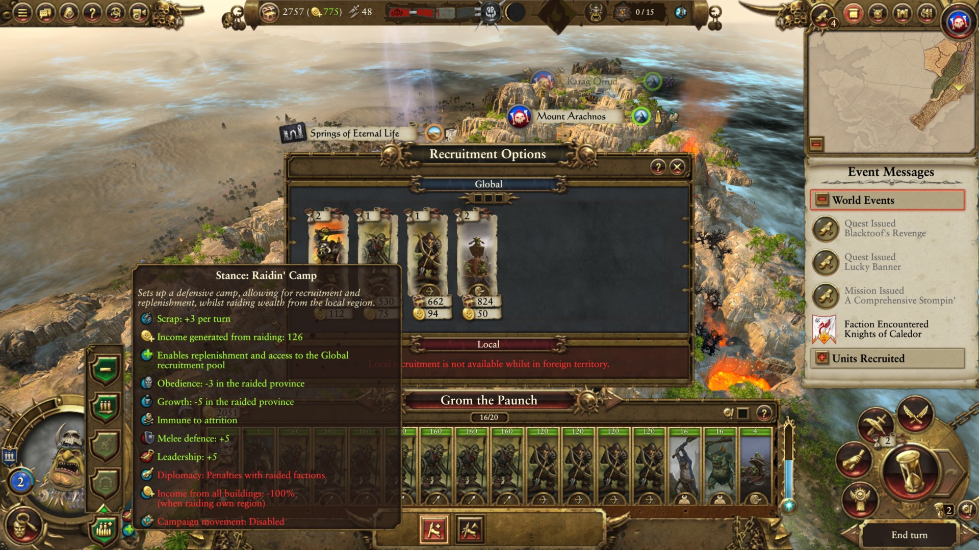 Synergizing extremely well with the new Waaagh! mechanics, the Greenskins faction overhaul also tweaks their Raidin’ Camp stance, allowing you to switch to it without requiring leftover movement points. Now, you could march straight into enemy territory and switch to Raidin’ Camp stance, gain some gold and scrap, disrupt public order and growth, be immune to all forms of attrition, increase your melee defense and leadership, all while having access to the global recruitment pool.