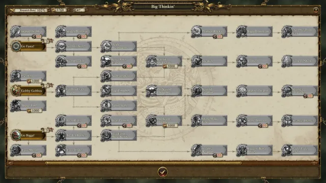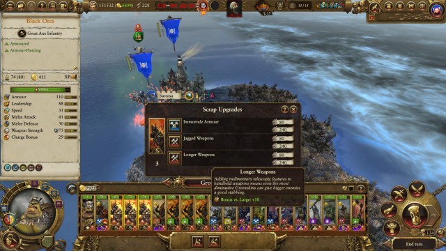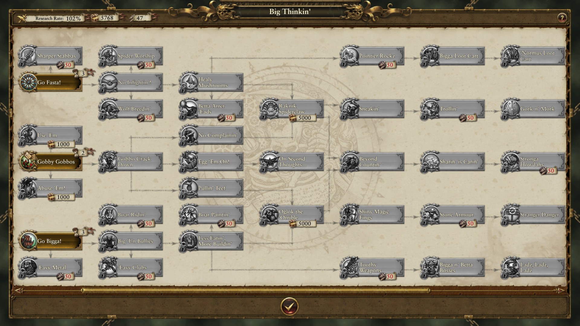 With regards to unit upgrades, some of these will still require you to have researched certain techs (or Big Thinkin’ as the Greenskins call ’em). Oh, and these techs also need you to spend 50 scrap just to initiate the research, though you only need to wait one turn to finish it.