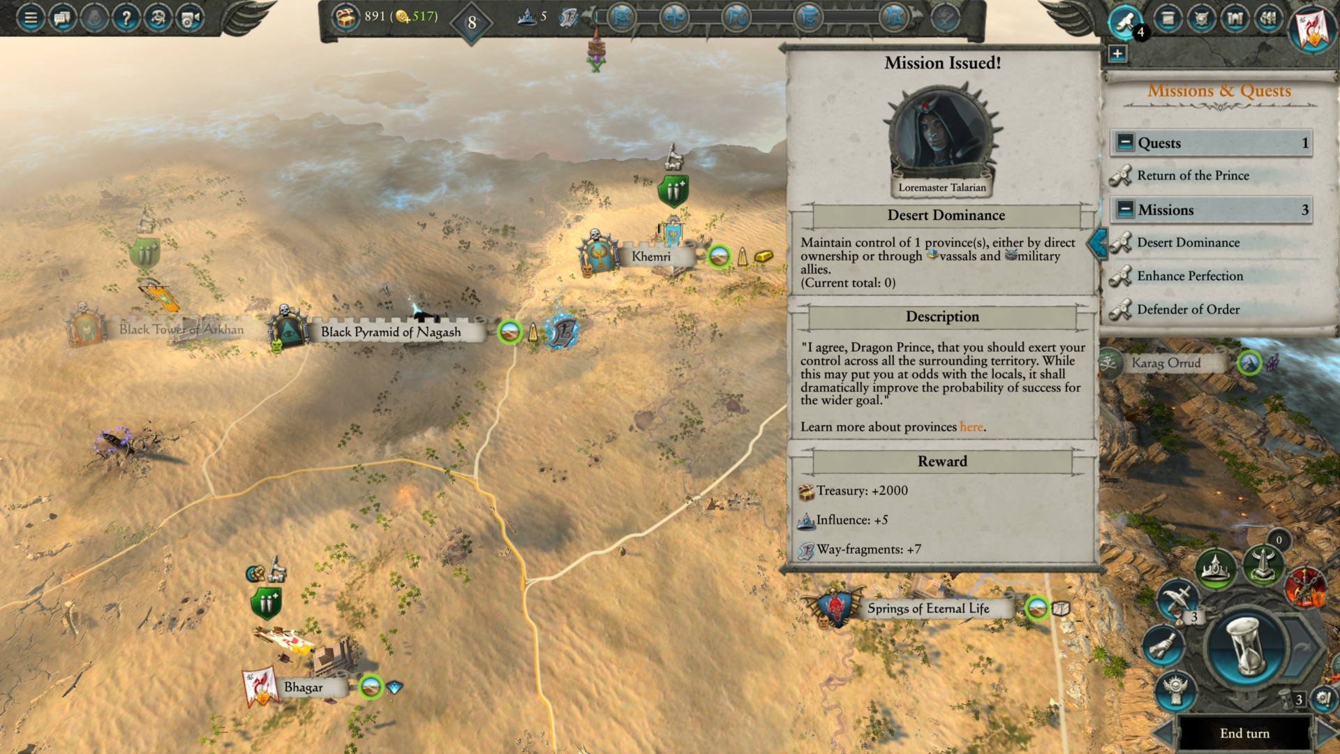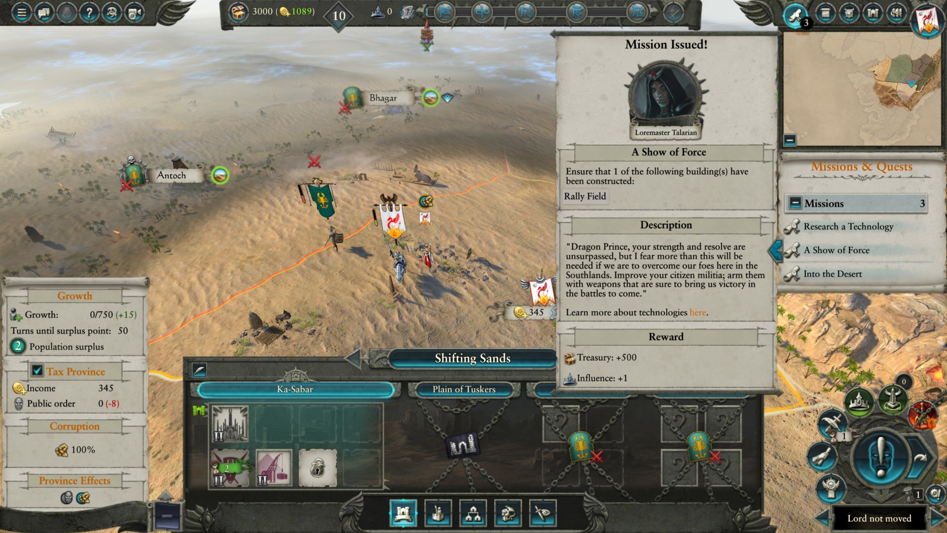 - Maintain 10 public order in the Shifting Sands province – +1,000 gold; +2 influence. You might need to exempt the province from taxation for a few turns (or at least use the Invocation of Asuryan once it’s available).