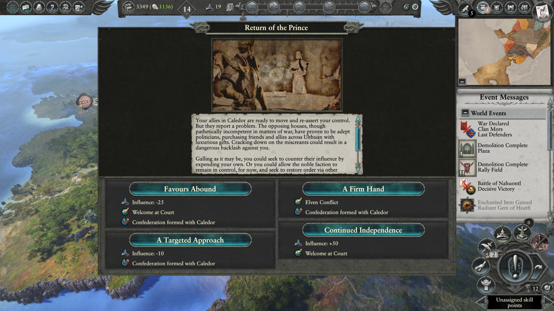 - Favors Abound – -25 influence; +40 diplomatic relations with High Elves for 10 turns; confederation with Caledor.