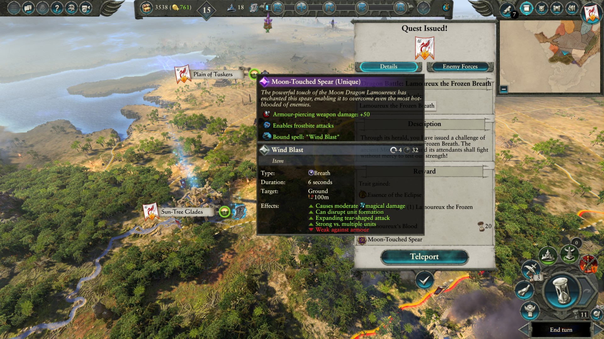 The good thing about the Lamoreaux battle is that the dragon only fields a few units. The bad news is that most of them are monsters. Still, if you’re going with a lot of spearmen units (anti-large bonus), then you should eke out a victory early on in Total War: Warhammer II‘s campaign. The terrain even works in your favor since you can lock down the pass with your spear wall/checkerboard formation, but do make sure that your line infantry don’t get chucked around mercilessly.