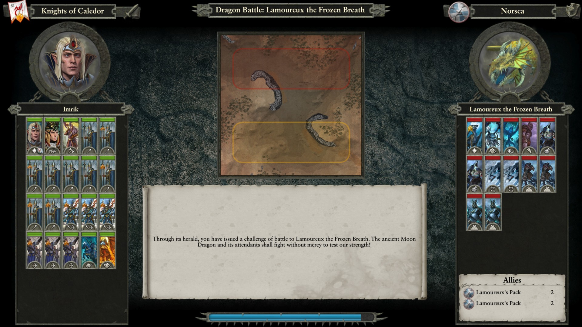 The biggest threat here would be a combination of Lamoreaux, the Frost Wyrm, and the Frostheart Phoenix all zooming straight for your archers. If they do, it’s game over since your ranged line will collapse (this actually caused me to restart the battle a few times). If you can manage to distract Lamoreaux and the Frost Wyrm with Imrik and the Sun Dragon respectively, then your ranged units could burst down the Frostheart Phoenix first before switching to other targets.
