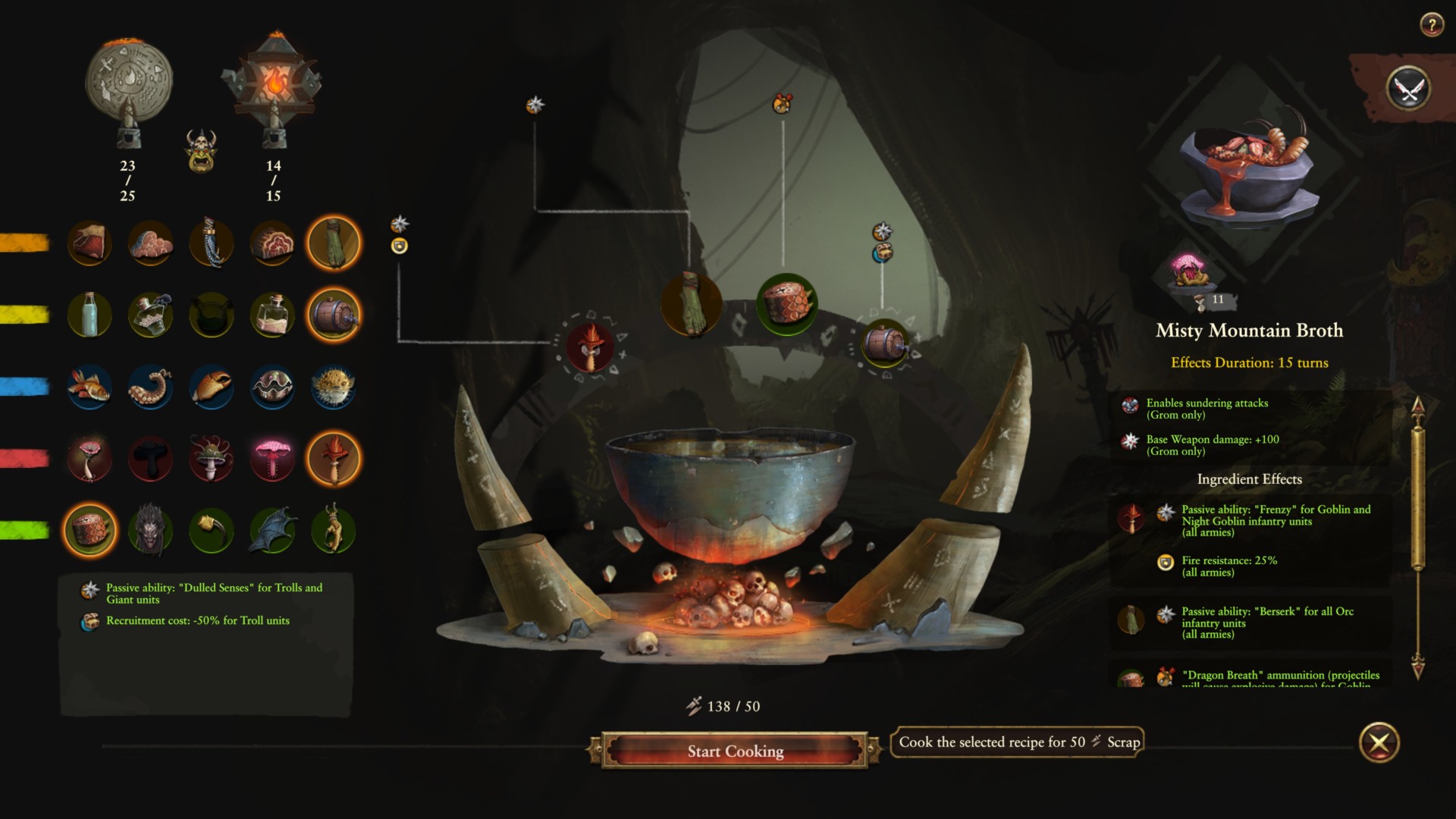 | Ingredient 4 (Bonus/Yellow) | Stunty Ale | “Dulled Senses” passive for Trolls and Giants; -50% recruitment cost for Troll units |