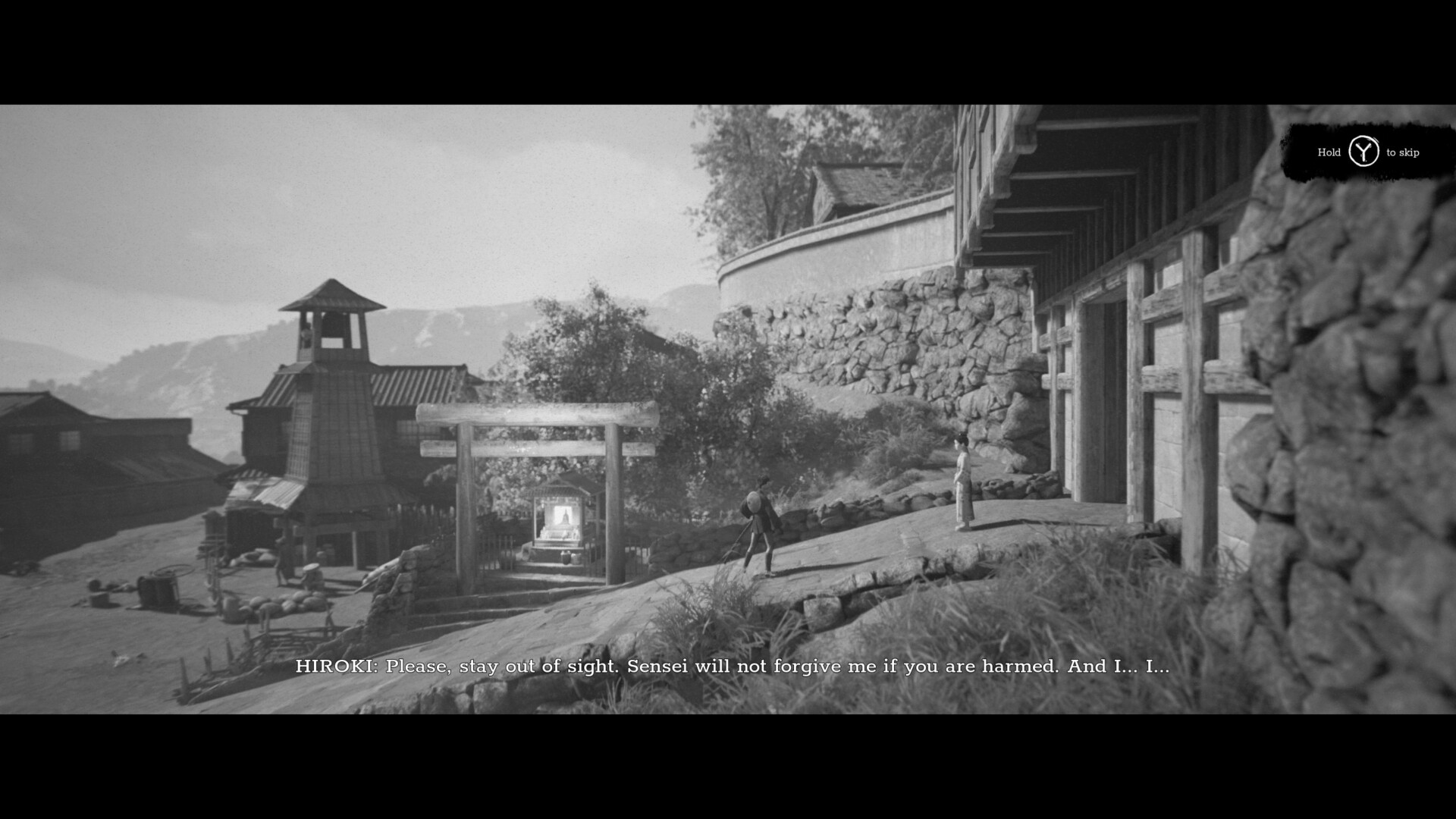 Time jumps ahead a bunch of years to show Hiroki and Aiko as adults. Bandits are attacking a nearby village, so Hiroki and some of his men head off to try and save the people. What happens next will have major consequences, as he finds himself drawn into something much larger than he could have anticipated. Trek to Yomi is entirely in black and white, with a grain filter on by default. It does its best to look like a classic Kurosawa film and, honestly, it works. The game is gorgeous and looks terrific.