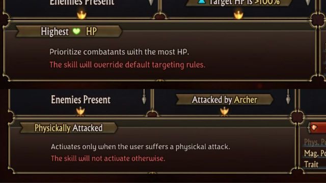 This is why it’s important to read the red text under your condition’s description. Other conditions can have the text “The skill will override default targeting rules,” which just means it’ll ignore its normal rules in favor of your set condition.