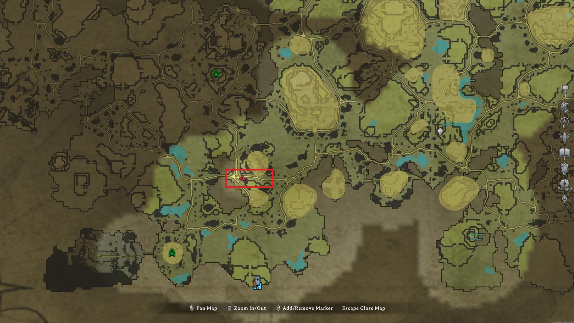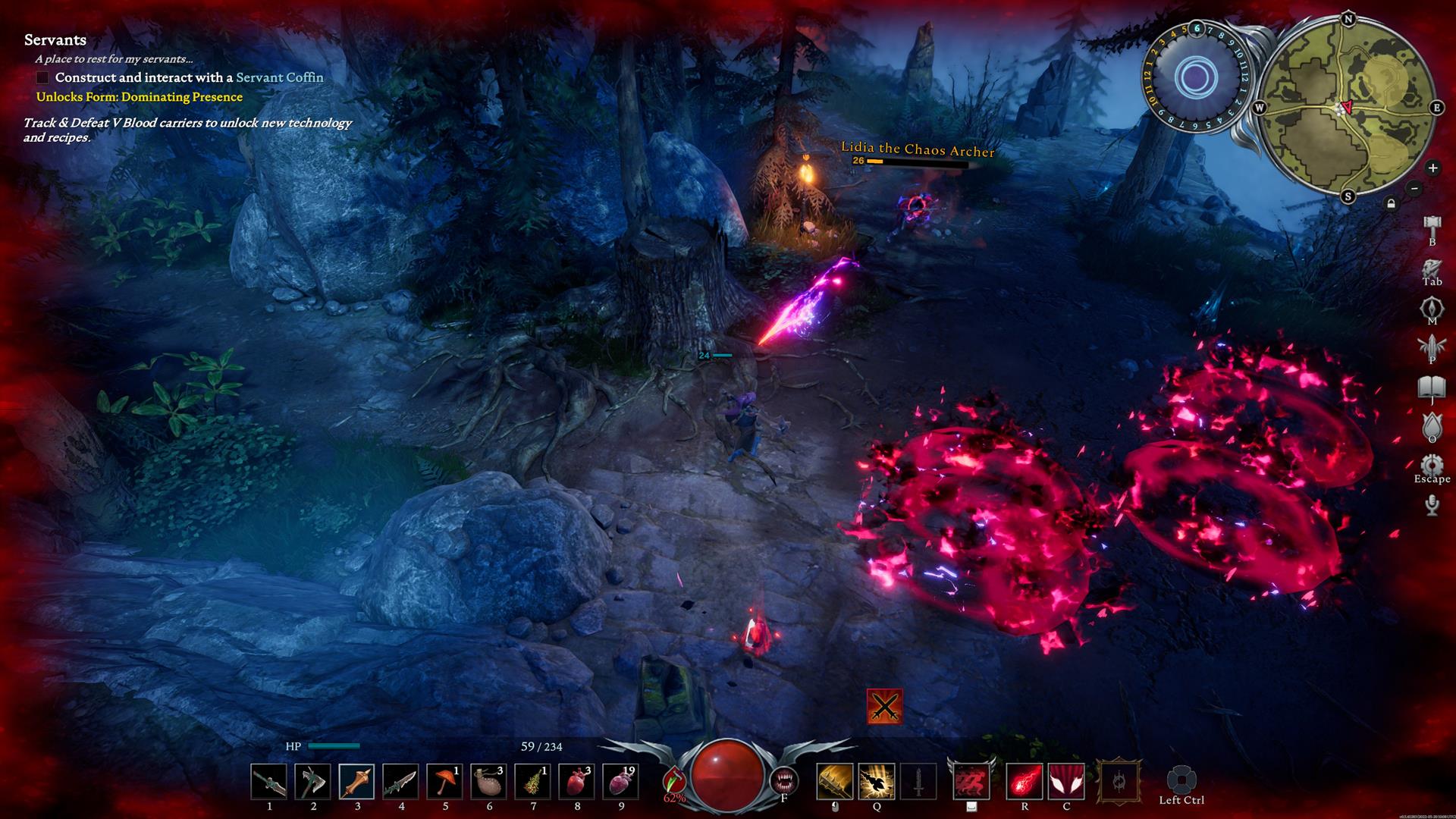 Lidia the Chaos Archer is found patrolling along the path between the small Bear Territory and Bandit Camp areas in Farbane Woods. This is a roaming boss, so your exact location for Lidia the Chaos Archer may differ from mine. Look southwest of Bandit Copper Mine which you’ve likely visited earlier and use the V Blood chart to track her.