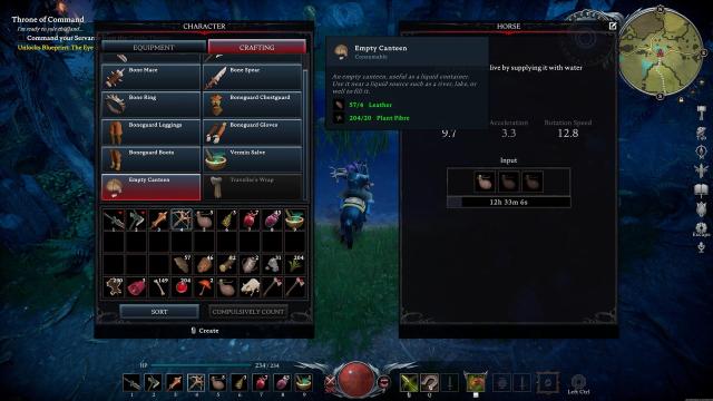 Note 1: Press the tab key and click on the crafting panel to make an Empty Canteen (4x Leather and 20x Plant Fiber). To fill it, go near a body of water such as a pond or river and use the item. You can then add this to the horse’s slots to increase the timer.