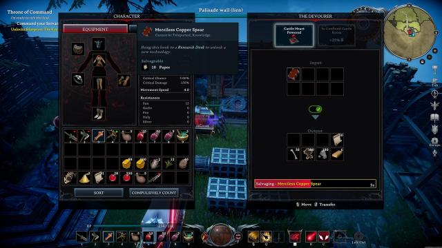 Last but not least, duplicate tomes need not go to waste. They still have a purpose, as they’ll let you get additional papers for technology recipes in V Rising. If you’ve already built The Devourer (i.e., 12x Plank and 6x Copper Ingot), you can throw in any duplicate tomes you have to obtain 10x Paper.