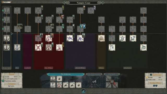For my Luthor Harkon playthrough, I mostly focused on consolidating the Vampire Coast province (fully owned). After that, I set up Pirate Coves for locations that were generally far from my start location or those provinces that I didn’t plan on fully controlling. The Pirate Cove feature is a lot better than, say, leaving an extra army to guard the hinterlands, since you can just scurry off to friendlier shores while the improvement passively nets you some benefits.