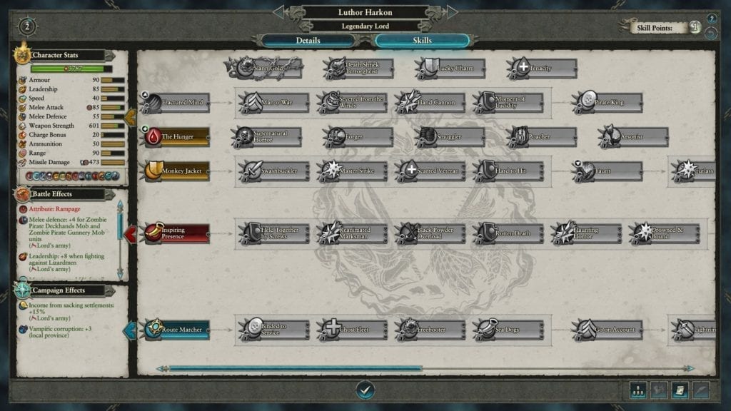 Your chosen legendary lord will also have certain unique traits which you can see in the image above. For this preview, we’ll focus on Luthor Harkon first. The Arch Grand Commodore and ruler of the Vampire Coast has the following:
