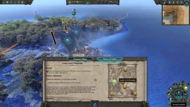 Speaking of treasures and quests, a new mechanic for Vampire Coast factions is their ability to dig for treasure. Doing so uses up all the movement points of a lord or hero, but has a chance to unearth some riches. You gain treasure maps from certain settlements you capture, quest completions, post-battle events, or rival pirates. These maps, in turn, will point you to a treasure chest on a random part of the campaign map.