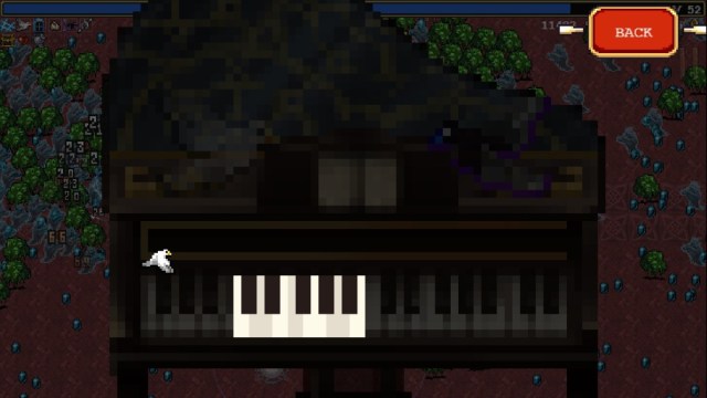 Once you’ve assembled your avian accomplices, the next step on your journey to unlock Avatar Infernas in Vampire Survivors is to head to the right. Keep going until you’ve passed the Gold Ring on the map. Shortly after this, you’ll encounter a purple reaper enemy known as The Trickster, standing guard over a seemingly innocuous piano. You’ll need to defeat him in order to proceed. He has a lot of health, but he also doesn’t move around at all, so you’re free to run laps around the piano to avoid other enemies while you whittle him down.