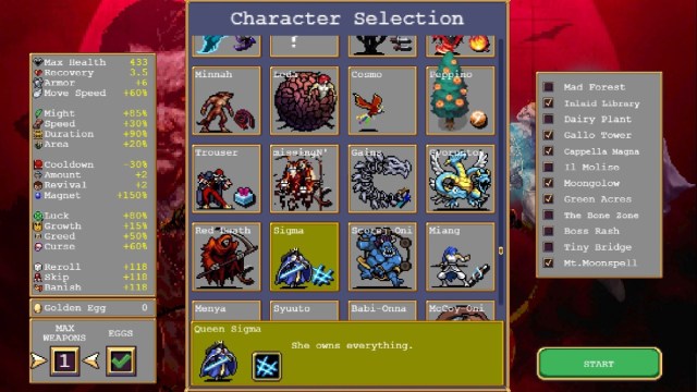In terms of character selection, the most important factor here is their starting weapon, since that’s all you’ll be able to use for the full run. Queen Sigma is a great choice, as her Victory Sword is ideal for focusing down tough enemies. Other good options include Imelda Belpaese and Dommario.