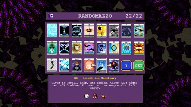 Once you’re in the stage, the next step of your quest to unlock Gyorunton is to choose Arcana XX – Silent Old Sanctuary as your starting pick. If you haven’t unlocked this Arcana card yet, check out our guide to learn how you can. This Arcana gives you 20% extra Might — and reduces your Cooldown by 8% — for each empty weapon slot you have. It’s ideal for this challenge, since you’ll only be using one weapon. This means you’ll have five empty weapon slots, so this Arcana will grant its maximum bonus of 100% extra Might, and a 40% cooldown reduction, making up for a lot of the power you lose by sticking to just one weapon.