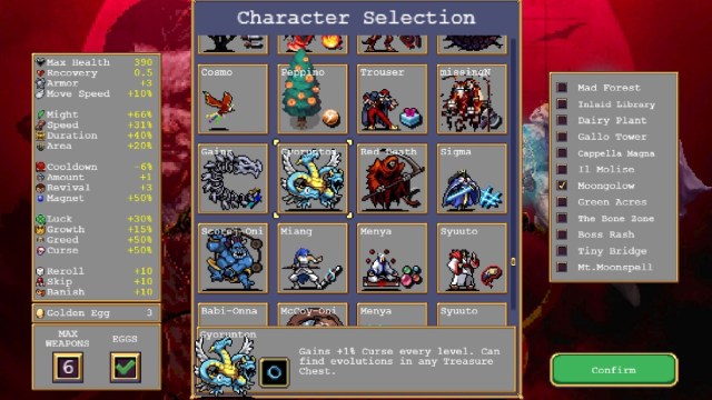 Once you’ve endured the trial above, you’ll hear Vampire Survivors’ ‘secret unlocked’ jingle, and Gyorunton will be unlocked! You can then head to the character select screen and purchase it for use in future runs. Gyorunton starts with great Health and Might stats, as well as the powerful Bracelet weapon, and gains 1% Curse every level, making it a great choice for Gold farming.