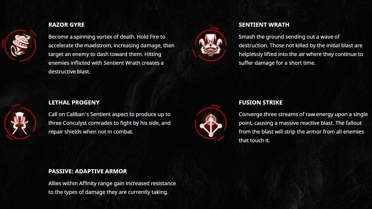 Not featured in the Warframe: The New War cinematic trailer, but definitely one of the most exciting things about the expansion, is the new Warframe. Caliban is a fusion of Sentient and Tenno capabilities. You can check out the Warframe’s abilities in the image below.