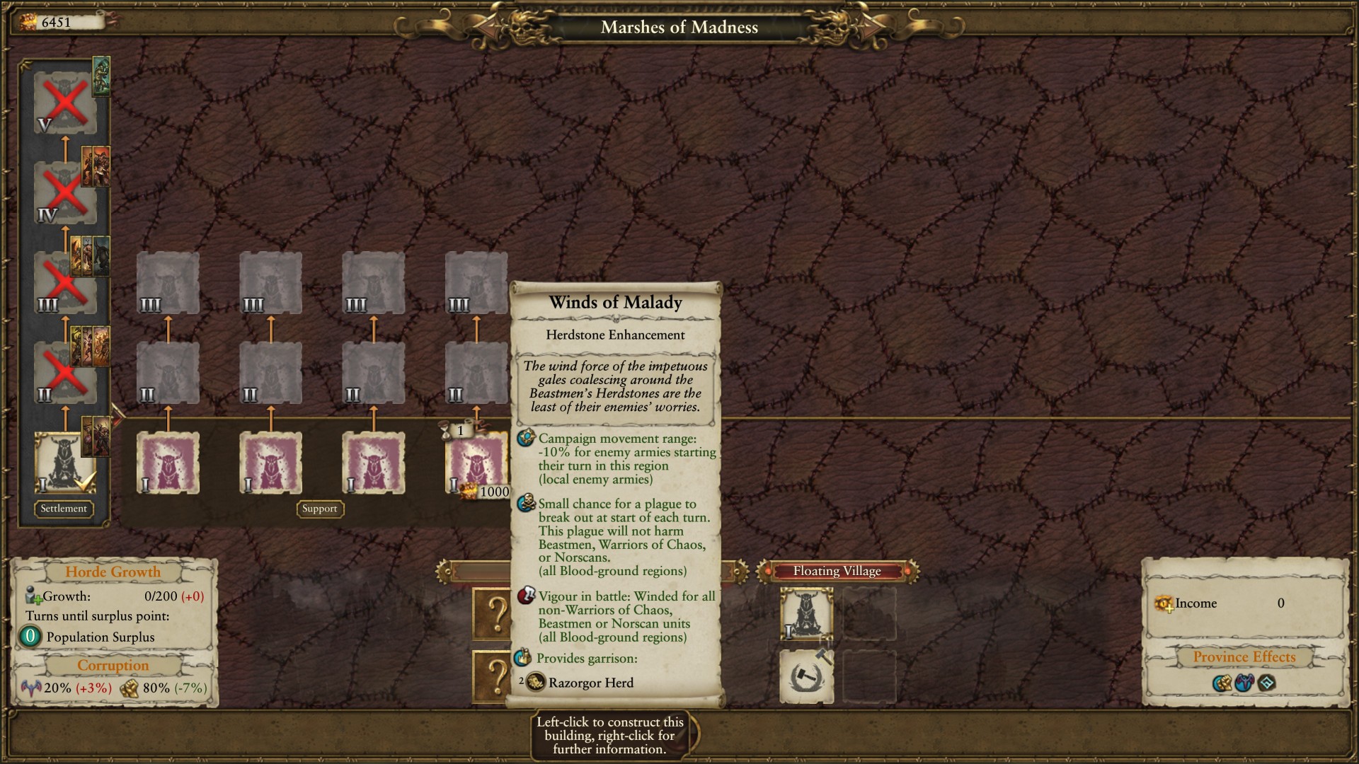 Most regions will only limit you to a main Herdstone building and two support buildings (unless there’s also a port that takes up a different slot). I suggest prioritizing the Shamanic Challenges chain if you want the Dread gains (faction-wide) and Winds of Magic reserves (all Bloodgrounds).