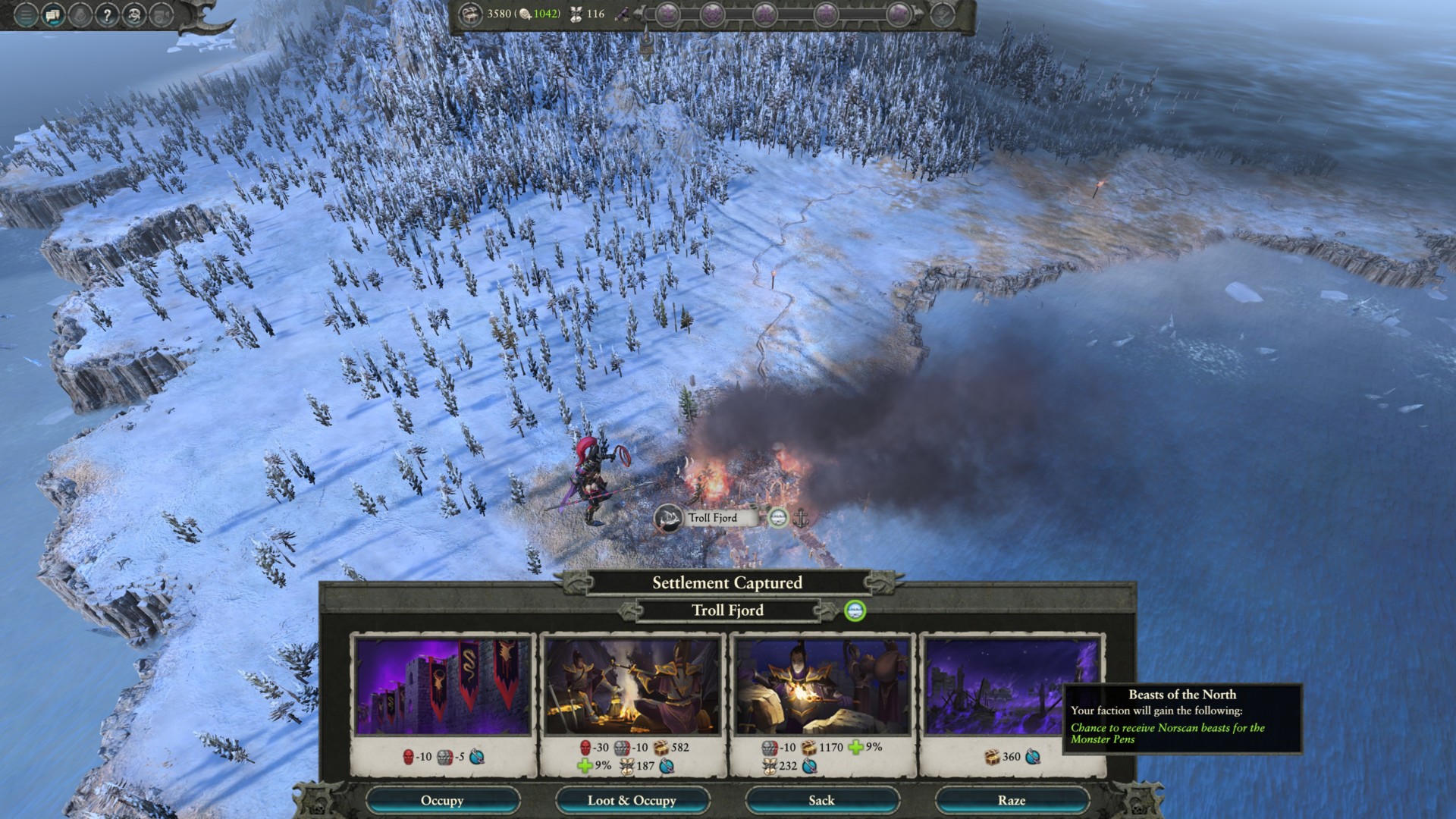 Regarding unlock conditions related to settlement captures, you should see several options such as “occupy,” “loot & occupy,” “sack,” and “raze” once you conquer new lands. There’s a small icon showing that each choice has a chance of providing you with a particular Monster Pen unit. Granted, this isn’t always guaranteed. If you don’t get the desired results, you might as well reload a save.