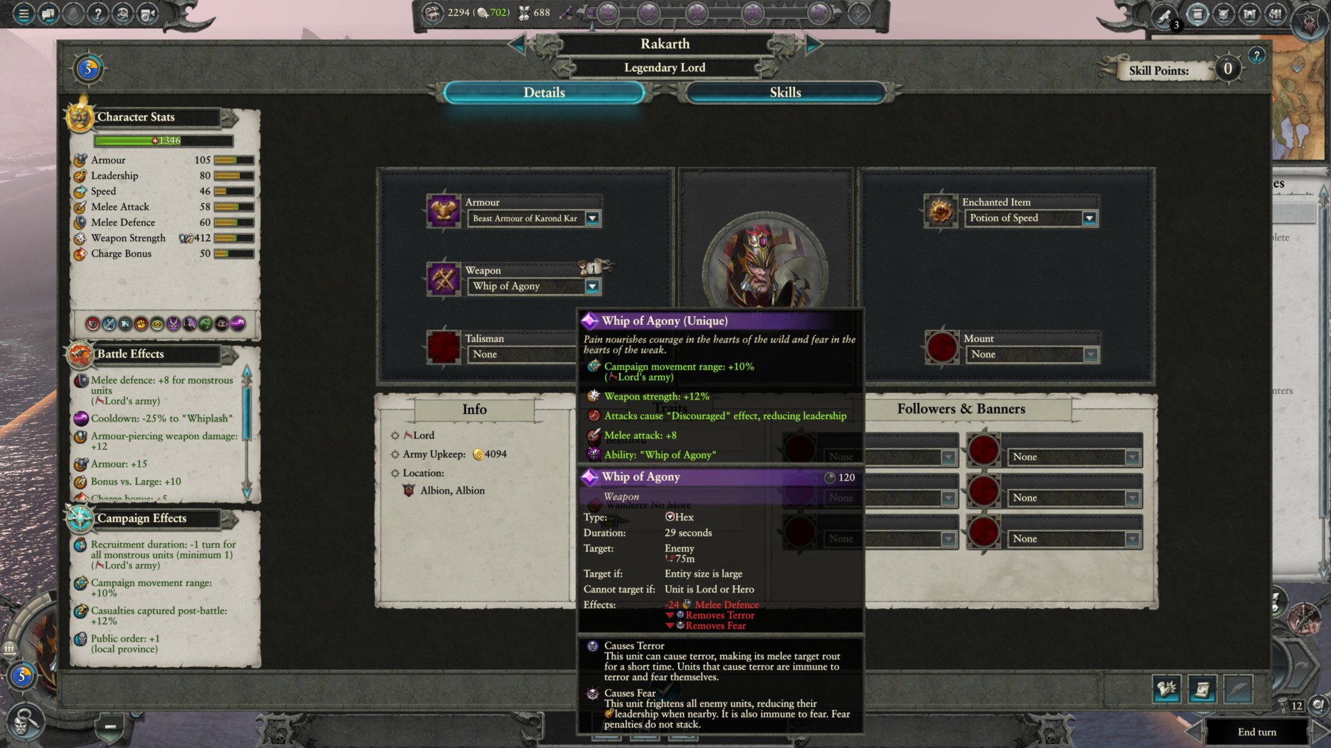 The Whip of Agony provides Rakarth with the following benefits in your Total War: Warhammer II campaign: