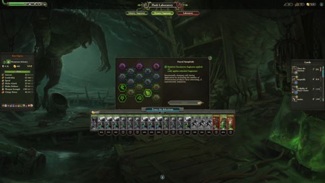I’ve gotta hand it to Creative Assembly here because Throt the Unclean is absolutely fun to play as. His unique mechanic, the Flesh Laboratory, allows him to infuse Skaven units with various mutations and buffs.