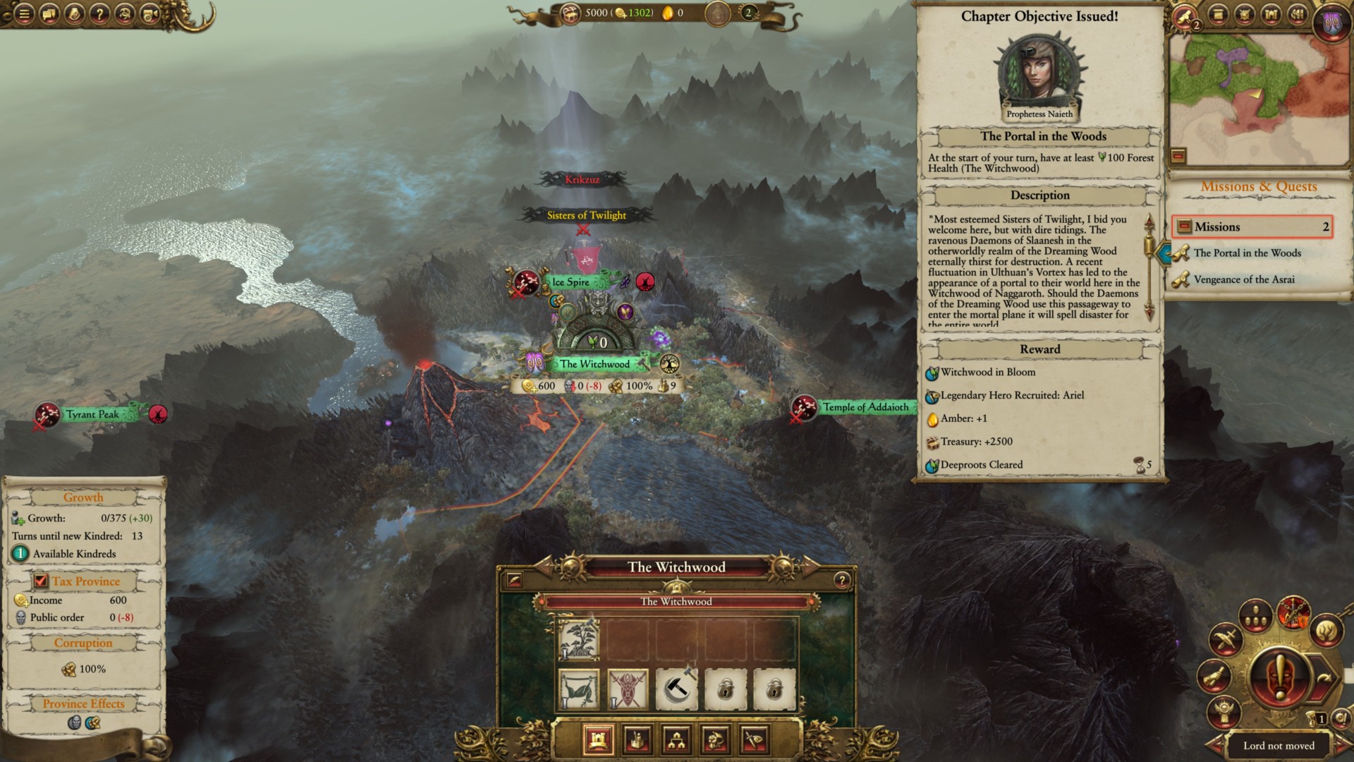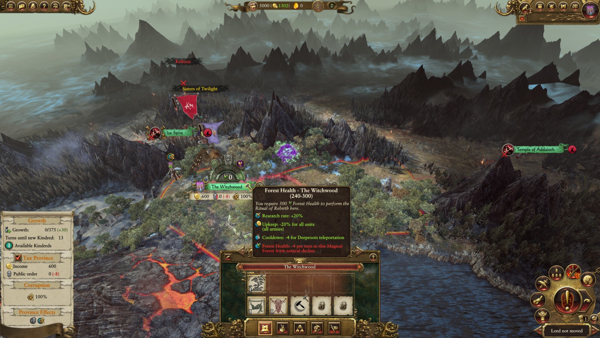 First, take a look at the Witchwood. This is a province with only one settlement that has 10 building slots. Likewise, you’ll notice that the magical forest confers boons once it reaches certain health thresholds.