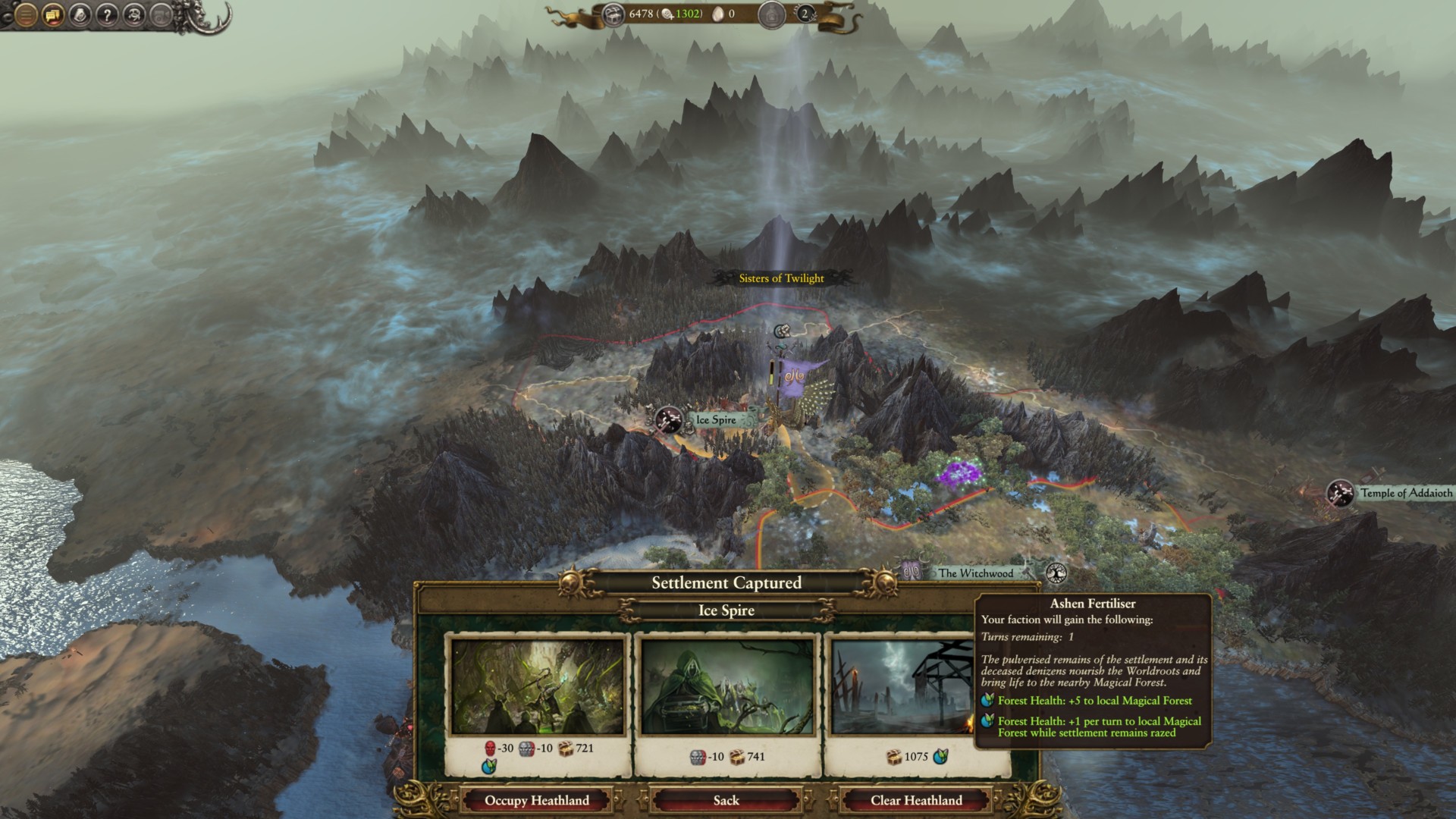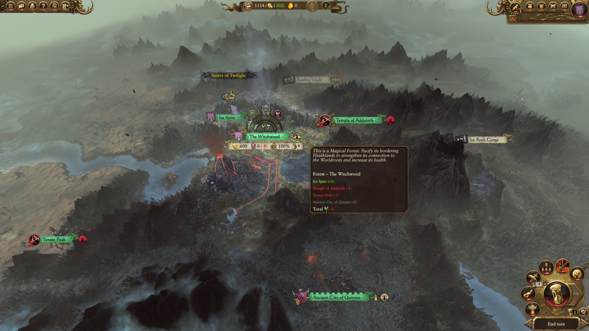 Since we control one heathland and two others are owned by a faction we’re at war with, there’s a penalty to the Witchwood’s health. That means we need to capture or raze heathlands eventually.