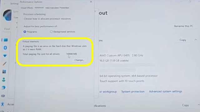 Let’s set up additional Virtual Memory. Open up the Windows File Explorer and navigate to the “This PC” icon and right click on the icon and then select “Properties” to bring up those options. Next go to “Advanced System Settings” and open that. Click on the “Performance” tab and then click the next “Settings” button prompt. From there you will see the “Virtual Memory” option which you can change from 2 GB to 10 GB. Apply the changes and reboot the device.