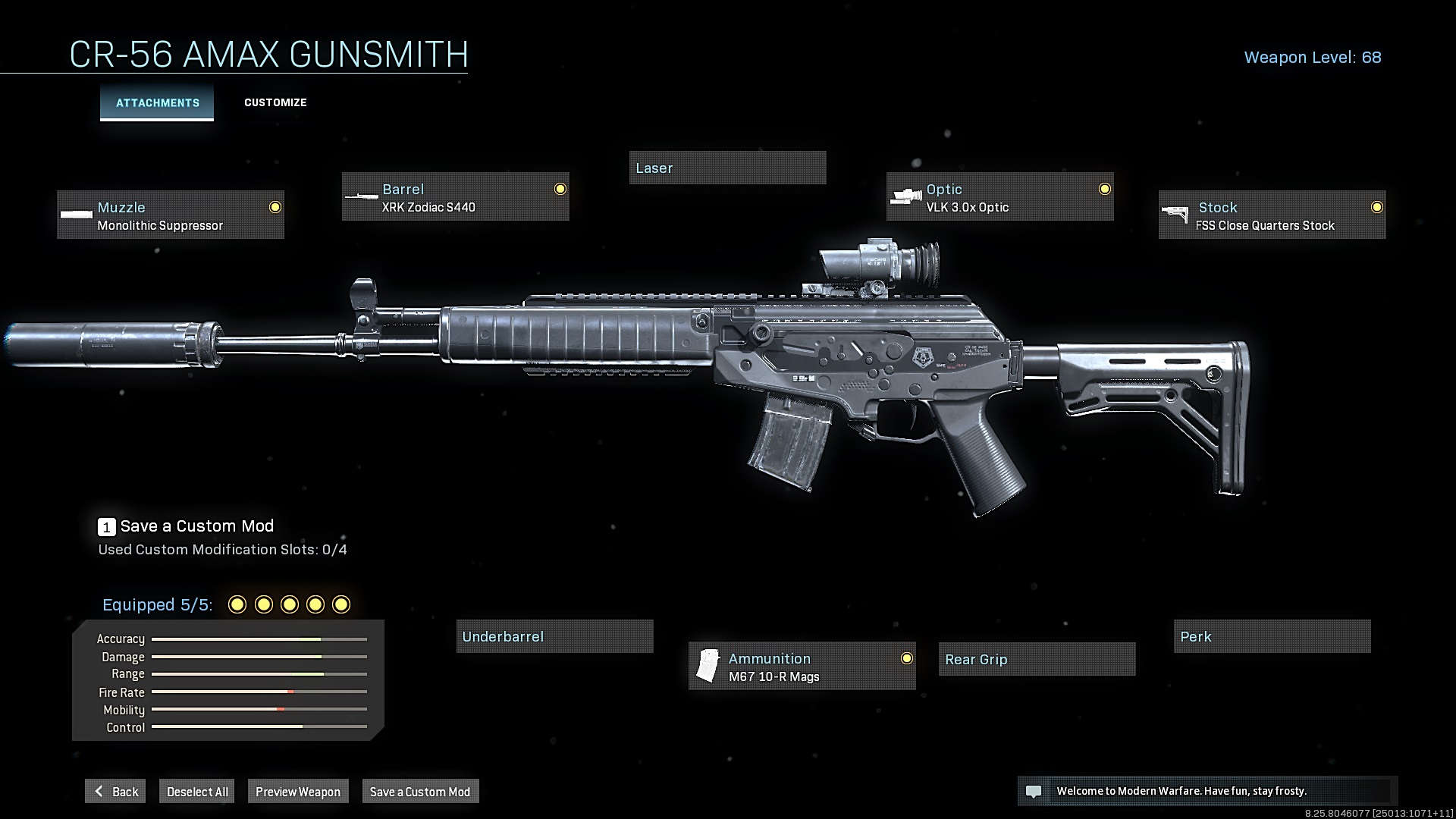 The CR-56 AMAX has so little horizontal recoil in the first place that you’re better off just doing everything possible to minimize its vertical recoil. The XRX Zodiac S440 Barrel will add better bullet velocity, recoil control and an increase in damage range to the weapon. At the same time, using the Commando Foregrip Underbarrel improves your accuracy by providing some valuable recoil stabilization and aiming stability.