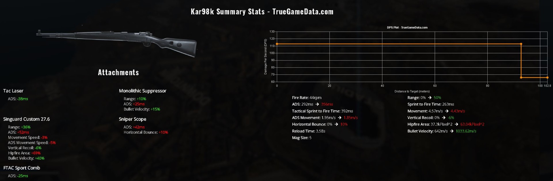 Thanks to its incredible base aim down sights (ADS) time of just 292 ms, the Kar98k feels snappy regardless of the attachments used. This is great, as it means that we can equip both the Monolithic Suppressor and Singuard Custom 27.6″ barrel with few notable downsides. When combined, these two attachments increase bullet velocity by 55%. This results in a total bullet velocity of 1,033 meters per second, which is only 15% slower than a fully built HDR. Although this is a noticeable difference, the Kar98k’s bullets still travel fast enough to make it a serious threat at long range.
