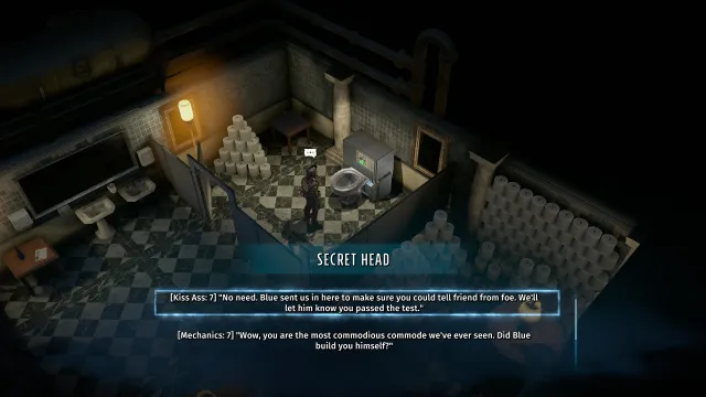 The chest (Lockpicking 9) in this room has 4x Tellurium, but the strange object here is Blue’s talking toilet called the Secret Head. Choose Kiss Ass 7 or Mechanics 7 so you can have a friendly chat with it.