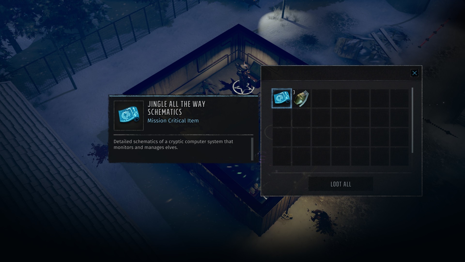 To gather evidence, head out back and kill the toads and other creatures. Open the shed to find elf corpses and the Jingle All The Way Schematics (quest item).