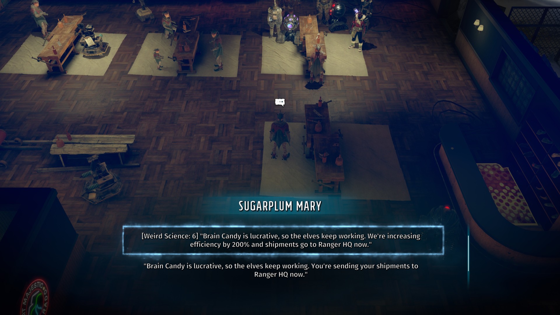 - Weird Science 6 – Doubles the production and drug shipments to Ranger HQ while overworking the elves.
