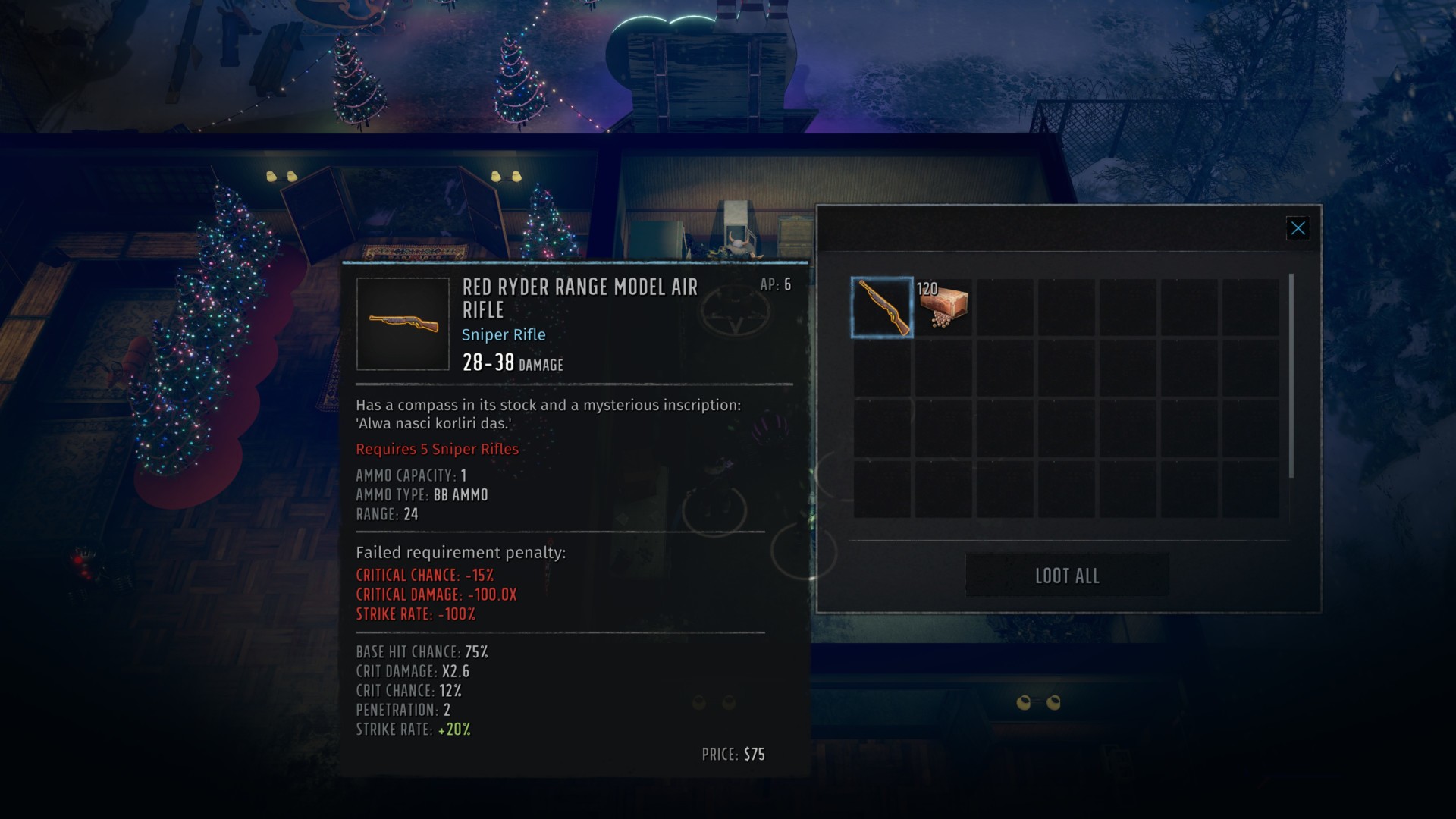 Anyway, the workshop (Lockpicking 10 or the key from Santa’s corpse) has the Commando Legs and Red Ryder Air Rifle (complete with its special pellet ammo).