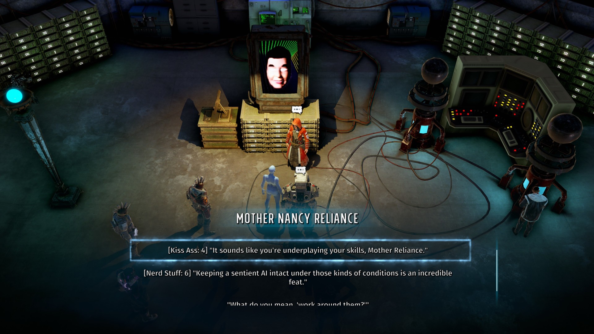 You can converse with Mother Nancy Reliance about a few subjects — using Kiss Ass 4 or Nerd Stuff 6 — and she’ll reveal how she facilitated the creation of the AI.