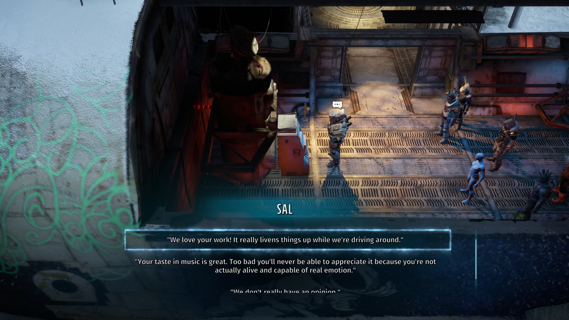 Make your way inside the crashed plane to find SAL — the DJ on the radio whenever you’re exploring Wasteland 3‘s world map. As it turns out, she’s also an AI construct.