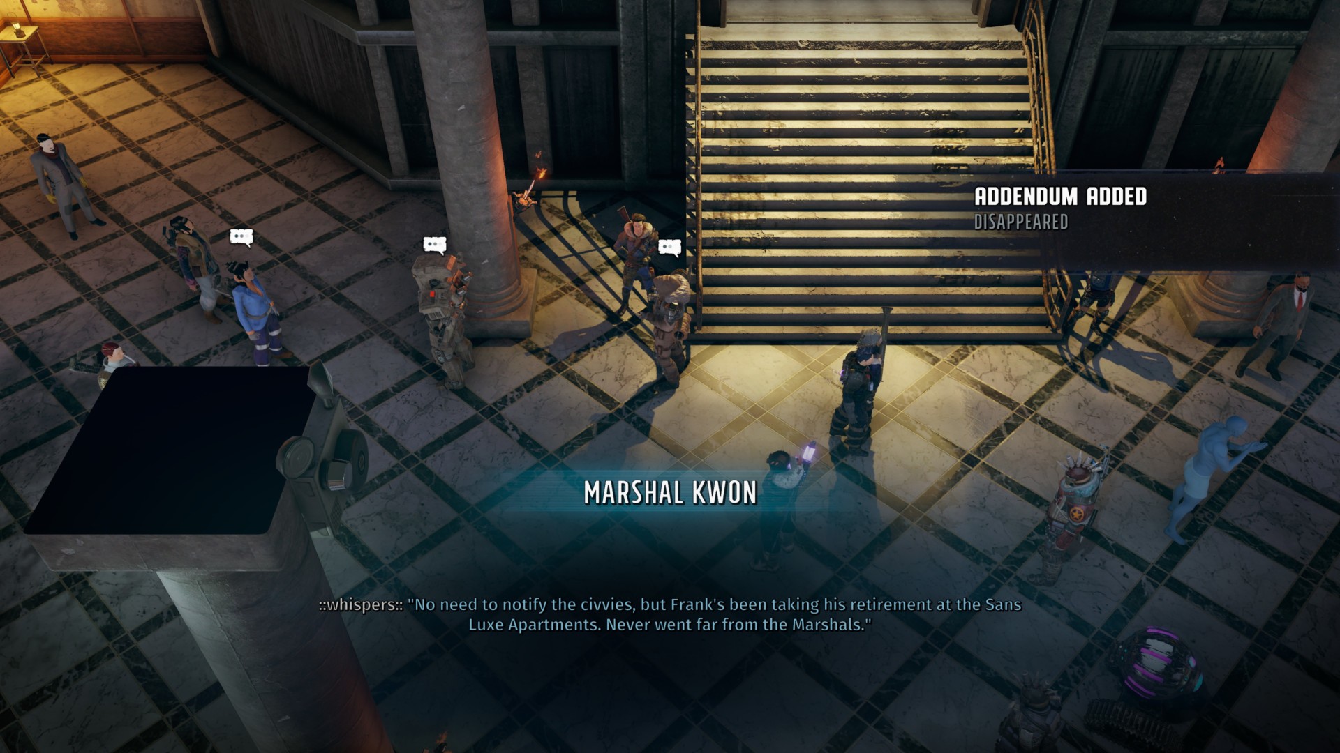 After handling the refugee issue in The Bizarre, return to Ranger HQ to meet a bunch of folks led by Betsy. You’re tasked with looking for a work camp supervisor named Frank Pappas. He’s the guy we met in Sans Luxe Apartments while searching for Irv and his clones.