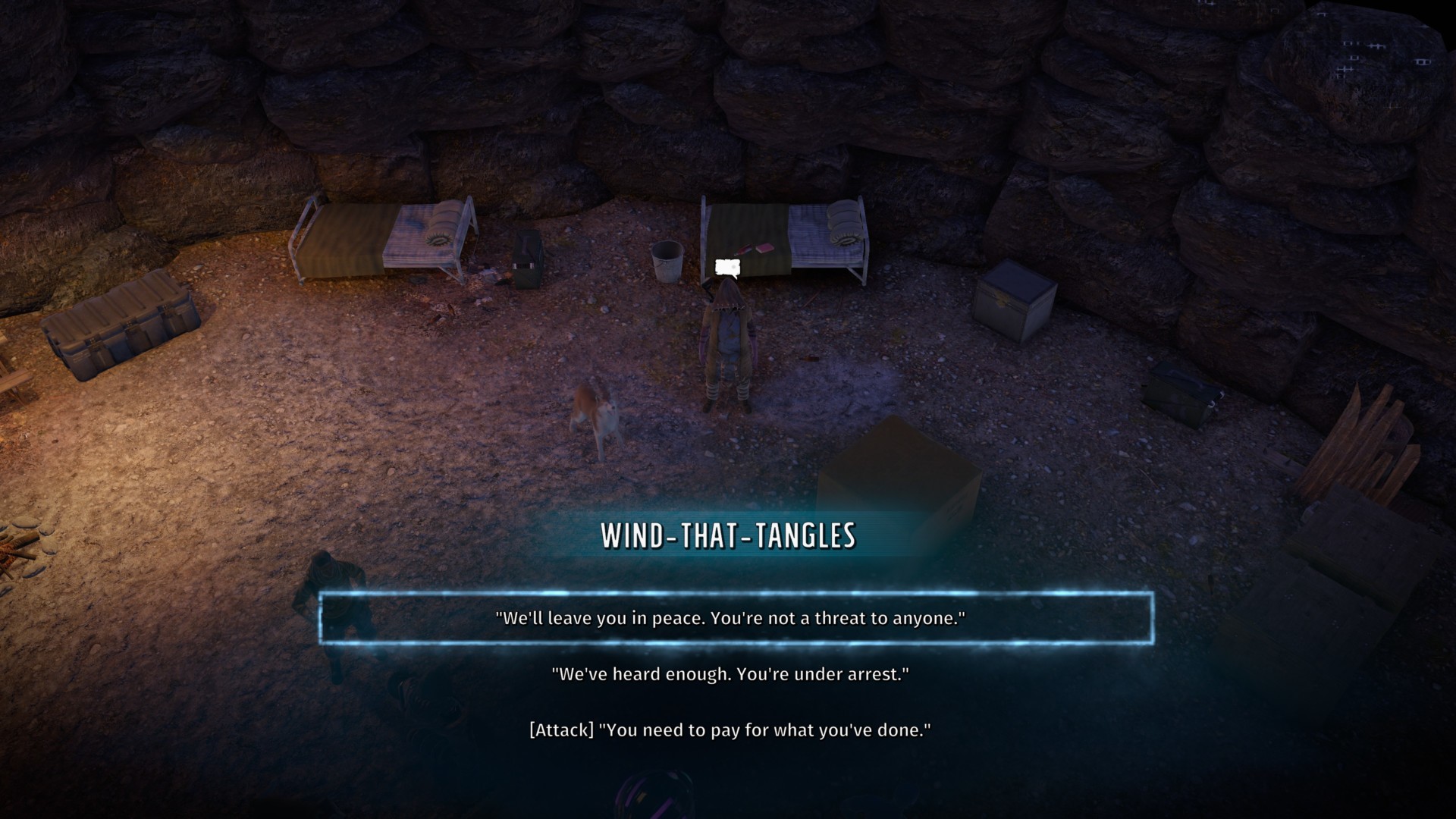 Inside the cave, you’ll meet Wind-That-Tangles, a former Godfisher, and his girlfriend, Nikki. You have the option to let them go or kill them (and their poor fluffy dogs too, aww).
