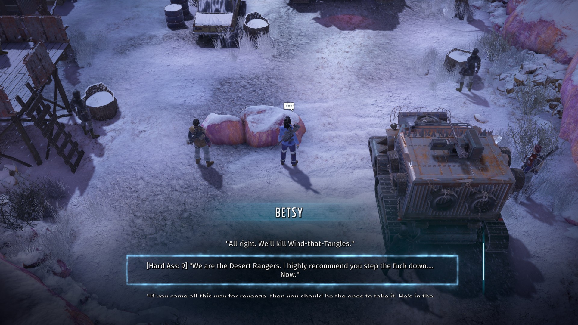 Assuming you followed Betsy’s suggestion, you’ll get the Nitro-Ray upgrade for the Kodiak. As far as I know, Wind-That-Tangles doesn’t play a major role later in Wasteland 3‘s campaign anyway.