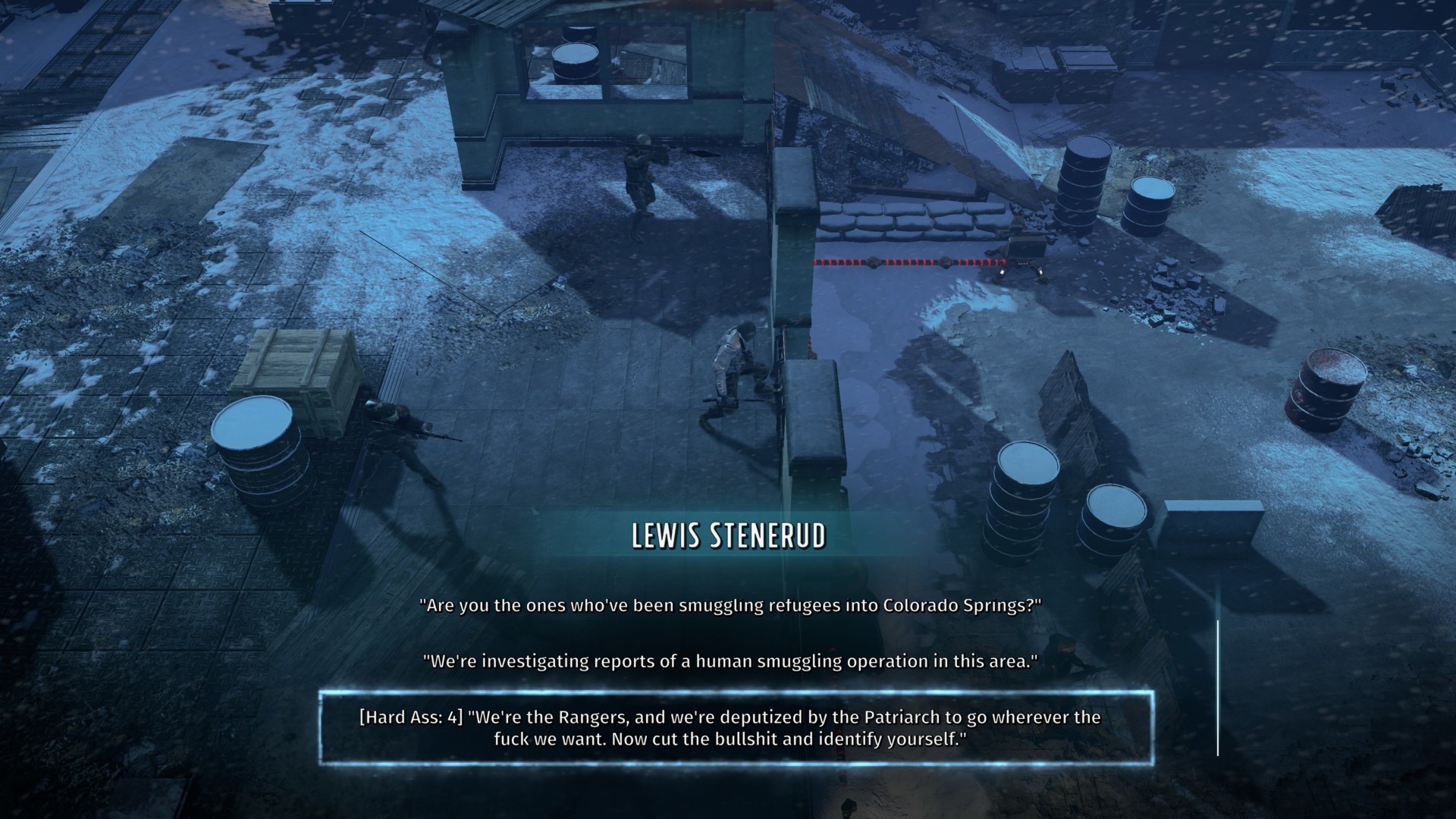 If you cross the bridge, you’ll meet Lewis Stenerud and the smugglers. Dialogue options won’t make his group back down, so you’ve gotta fight.