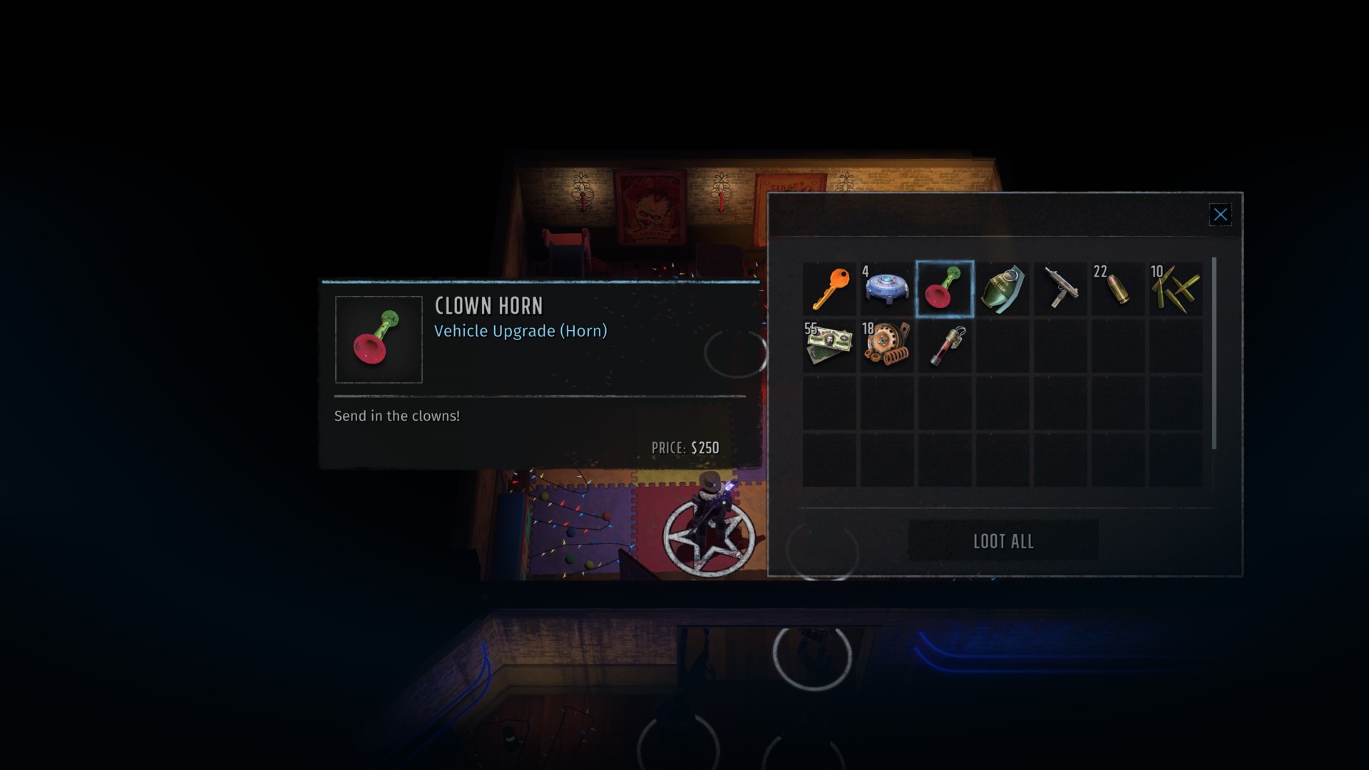 The room upstairs has Ditso’s safe containing a key for storage unit 107 (back in the storage room area), the Clown Horn Kodiak cosmetic, and several guns, ammo, and mods. You’re done here so return to Flab the Inhaler.