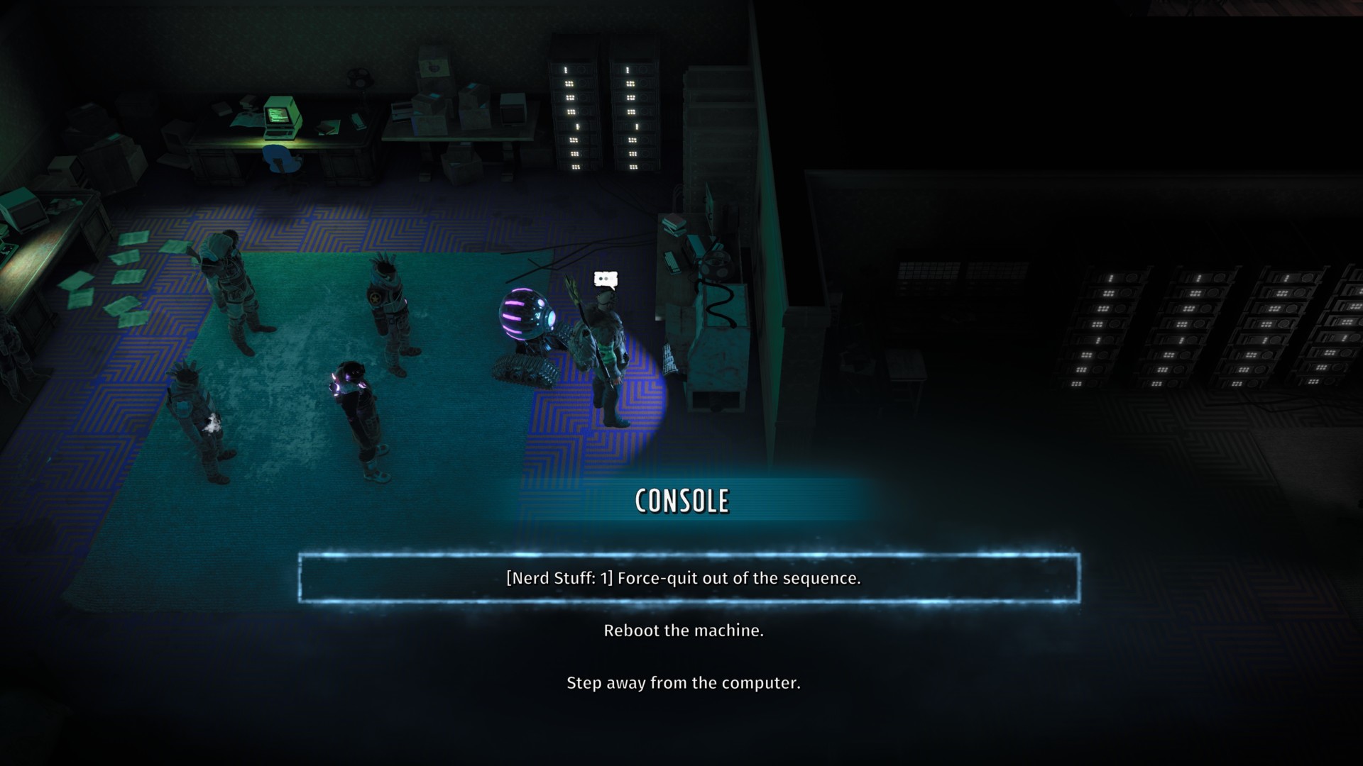 The middle room has Valor’s lab. It has several computers. You can interact with the console (Nerd Stuff 1). This is followed by two more options (Nerd Stuff 8 or Weird Science 7) to correct the algorithm.