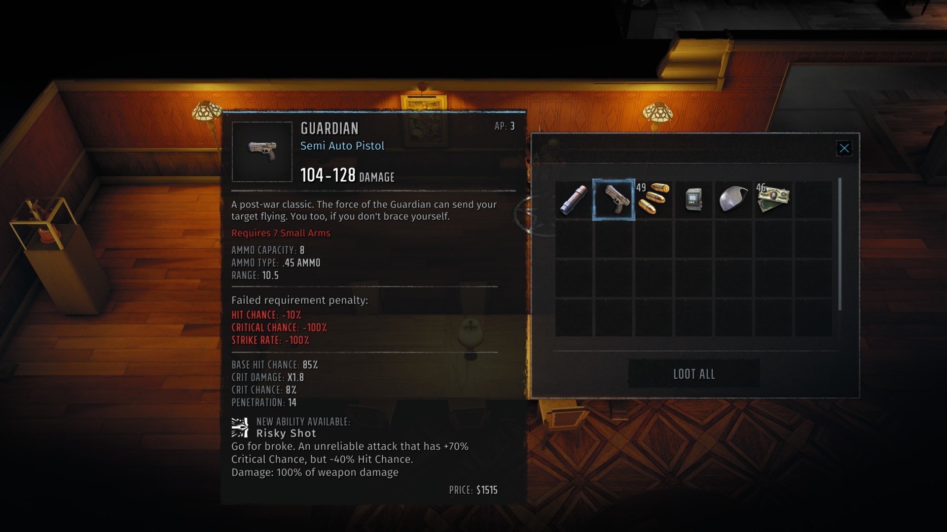 I digress. Anyways, you’ll find some miscellaneous loot here such as adoption papers and a book about popular pastimes (detected by Perception). You can inspect one of the vases to loot Liberty’s stash which includes several mods and a Guardian pistol.
