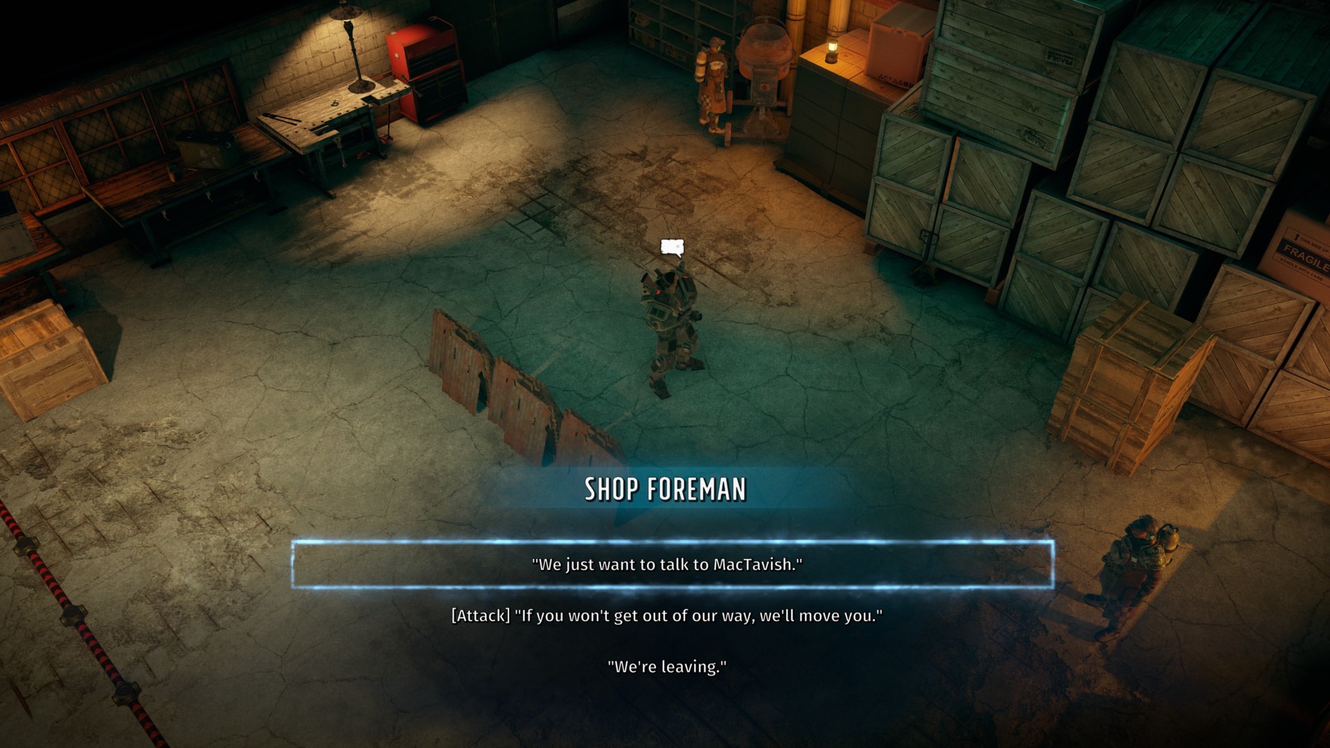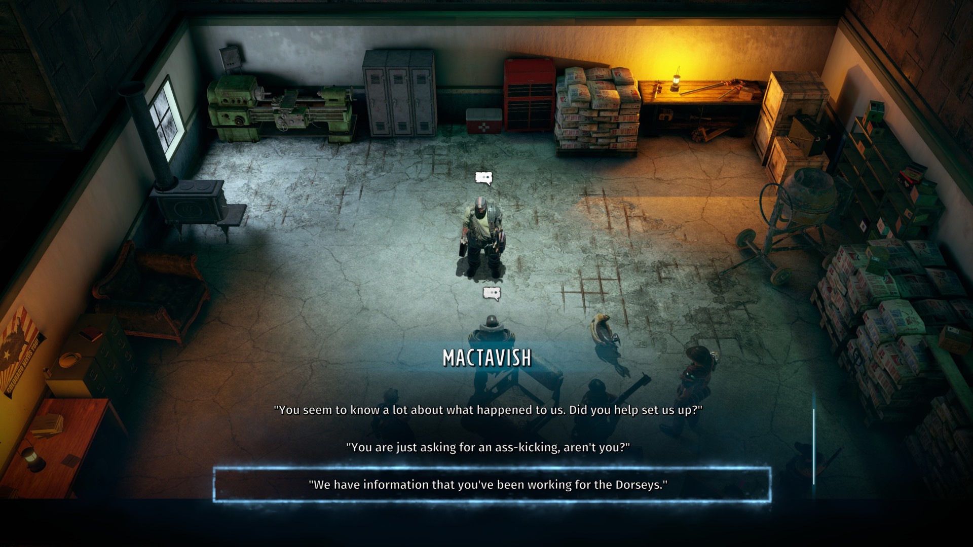 The thugs inside the Machine Shop want you to leave. You can attack immediately or ask about MacTavish (which also leads to a sudden battle).