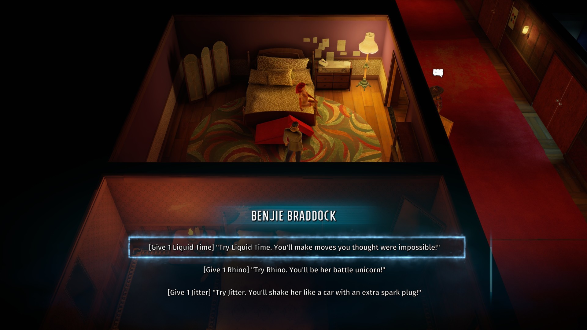 Also, the first time you open the Queen of Hearts’ room, you’ll find Benjie Braddock who has some “problems.” Tell him he just “needs chemical help” and give him either Liquid Time, Rhino, or Jitter. You can ask him for leverage against Brygo to get the Code to the Computer. This is only if the door to Brygo’s suite remains locked.