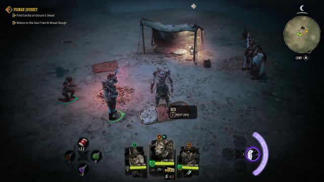 When exploring other areas, you might come across beds that can be used, too. Lastly, if you’re traveling on the world map, you can mouse over an empty location and press the “C” key. Your party will head there and set up camp. This spot will have a bed and an open fire, but you might need to kill a few wild animals so you can rest.